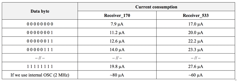 測(cè)得的電流值表明Receiver_533電路芯片消耗的電流略高于Receiver_170電路的電流。這是因?yàn)橛捎谑褂昧烁郊拥妮o助服務(wù)位S1S0,Receiver_533電路中的傳輸信號(hào)要長(zhǎng)兩位。因此,可以總結(jié)出,帶有RC元件的芯片所消耗的電流遠(yuǎn)小于帶有OSC 2 MHz振蕩器的芯片所消耗的電流。