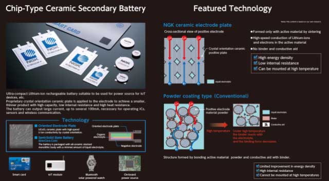 EnerCera有兩種類型:“ EnerCera Coin”,一種厚度為1毫米至2毫米的硬幣型電池,用于安裝在電路板上;“ EnerCera Pouch”,一種超薄且可彎曲的電池,厚度為0.4毫米至0.45毫米,用于嵌入卡。EnerCera硬幣是通過向其帶有電極和隔板的全陶瓷堆疊式整體中添加少量液體電解質(zhì)制成的。NGK將這些獨(dú)特的電池定義為半固態(tài)電池。他們?nèi)〉昧耸澜缟系谝粋€(gè)工作溫度為85°C的鋰離子二次電池,使用壽命長達(dá)10年,這是對(duì)物聯(lián)網(wǎng)設(shè)備的兩個(gè)很大要求。