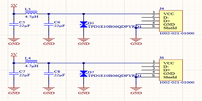 除了電源濾波之外,我還為每個輸入添加了一些基本的ESD保護。如果像許多貿易展覽會場館一樣跪在地毯上,準備好相機準備插入設備時會積聚靜電,這很容易導致ESD事件損壞相當昂貴的設備。通過在輸入端和穩(wěn)壓器板上提供ESD保護,我們應該為攝像機提供相當高的保護等級。我在主電源板上使用的5v線路使用的是相同的0402尺寸TVS二極管TI TPD1E10B06QDPYRQ1。這些雖然很小,但具有汽車認證資格,并且可能能夠在中高濕度條件下處理海平面上的ESD事件。