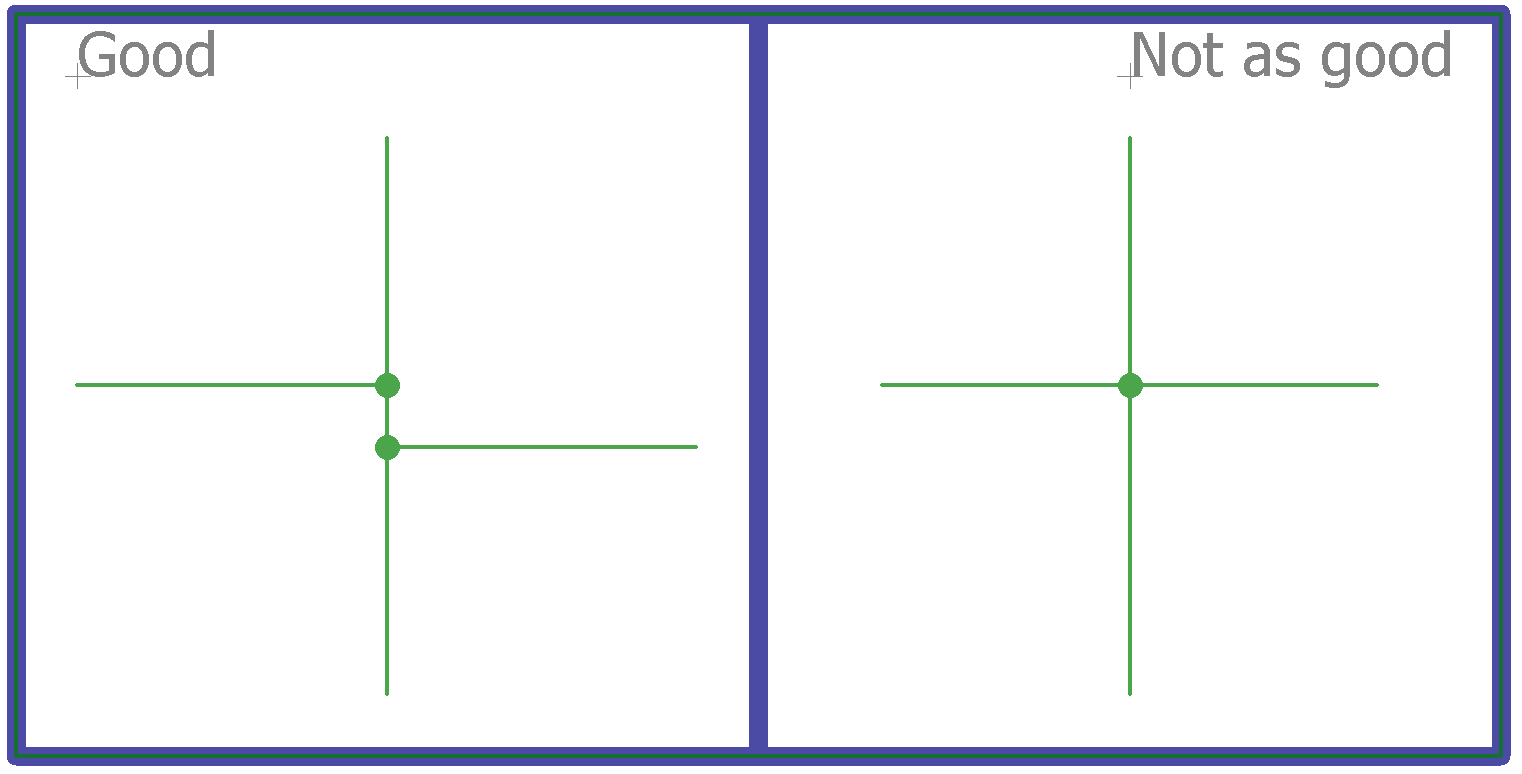 你可以看到有和沒有連接點(diǎn)的一組重疊和連接的網(wǎng)絡(luò)。當(dāng)添加相交的結(jié)點(diǎn),還建議避免四通,因?yàn)檫@可能會(huì)增加讀取電路時(shí)的混亂。而是選擇一組共享的交叉點(diǎn),如下圖所示,其中每個(gè)交叉點(diǎn)都有自己的唯一連接。這樣可以更輕松地準(zhǔn)確理解正確的連接并避免誤解。